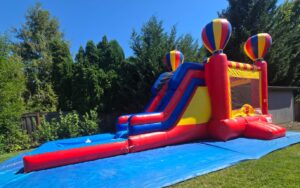 The slide combo (WITH POOL) is 35′ x 15′ x 15′ and requires 37′ x 18′ to operate safely. $300 includes up to 8-hour rental, delivery, set-up, tear-down, & pick-up for all reservations in residential locations.